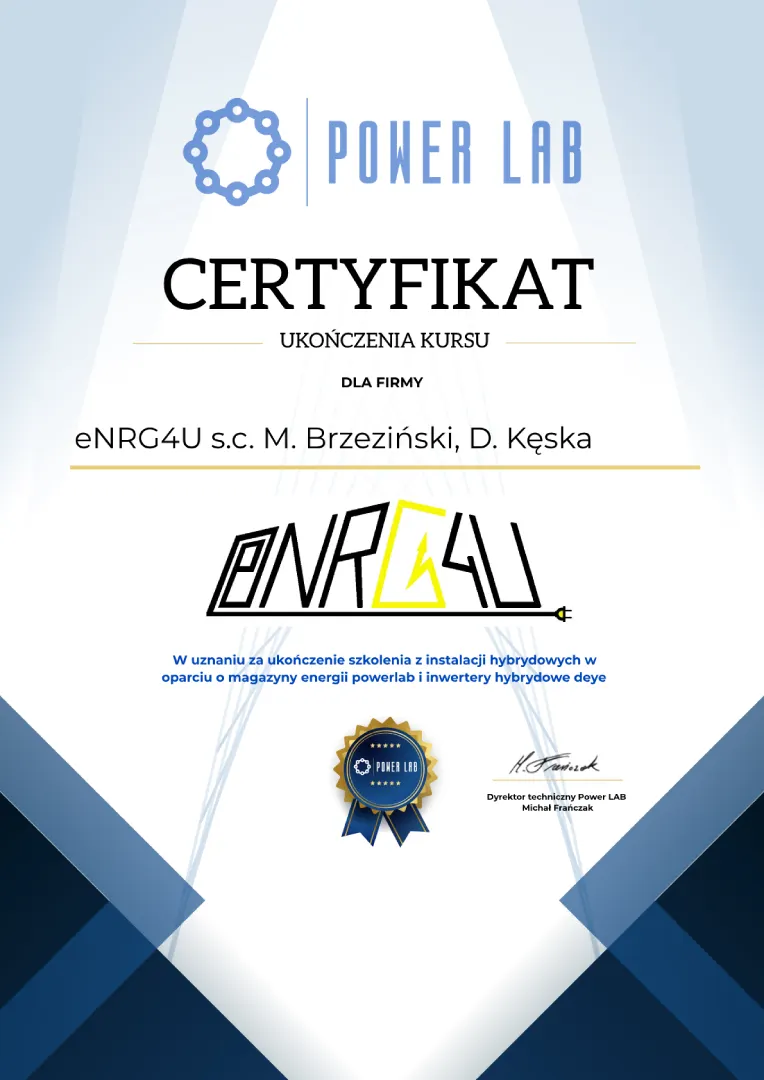 DOSKONAŁA 52 opiniiOpublikowano na Krystian Łakomski Z pełnym przekonaniem polecam tę firmę. To prawdziwi profesjonaliści. Panowie, którzy realizowali u mnie instalację, wykazali się ogromną wiedzą, doświadczeniem i zaangażowaniem na każdym etapie prac. Montaż przebiegł sprawnie, terminowo i z niezwykłą dbałością o detale. Panowie wszystko dokładnie wyjaśniali, cierpliwie odpowiadali na pytania i doradzali najlepsze rozwiązania. Widać, że znają się na swojej pracy. Instalacja działa bez zarzutu, a cały proces od pierwszego kontaktu po uruchomienie systemu był na najwyższym poziomie. Jeśli ktoś szuka rzetelnej, uczciwej i godnej zaufania firmy fotowoltaicznej, to zdecydowanie polecam każdemu!Opublikowano na Sebastian Baniowski Jestem bardzo zadowolony z montażu instalacji fotowoltaicznej. Cały proces przebiegł sprawnie i profesjonalnie – od doradztwa, przez terminowy montaż. Panowie są punktualni oraz kompetentni. Instalacja działa bez zarzutu. Zdecydowanie polecam tę firmę każdemu, kto rozważa fotowoltaikę.Opublikowano na Janusz Piwoński Firma profesjonalna, instalacja fotowoltaiczna wykonana szybko i rzetelnie.Opublikowano na Krzysztof Komornicki Firma bezsprzecznie godna najwyższego uznania i polecenia. Rozbudowa stacji PV zgodnie z terminarzem i kosztorysem. Wszystko solidnie, czysto, bezpiecznie i termonowo. Pełny profesjonalizm. Dziękujemy za wszystko!Opublikowano na Mariusz Radolinski Fachowcy najwyższej klasy. Doradzą, wytłumaczą. Realizacja na czas. Wpelni profesjonalne wykonanie. Zalatwia za Ciebie wszystko. Miałem wielu fachowców u siebie ale oni są godni polecenia i współpraca z nimi to czysta przyjemność.Opublikowano na Flybro Z czystym sumieniem mogę polecić tą firmę. Panowie montowali mi magazyn energii do istniejącej już mikro instalacji PV i widać,że posiadają wiedzę w tych tematach. Na każde moje pytanie odpowiadali tak żebym zrozumiał. Pomogli mi również że zmianą warunków w Tauronie i załatwili po montażu dotację ,co było dla mnie bardzo ważne. Po skończonej pracy zawsze zostawiali po sobie porządek. Na sam koniec przysłali mi jeszcze maila z dokładnym opisem skrzynki rozdzielczej po ich zmianach. Na plus jest też to , że magazyn jest na kółkach i można go przesunąć gdy chce się posprzątać. Jeszcze raz mogę powtórzyć, że jest to firma godna polecenia.Opublikowano na Wojtek Firma godna polecenia. Świetny kontakt telefoniczny i mailowy. Punktualni, profesjonalni i skrupulatni. Realizacja fotowoltaiki na gruncie z bankiem energii zamknęła się praktycznie w 2dni robocze. Miejsce realizacji prac czyste i schludne jakby ich nie było. Jeśli chcecie uzyskać odpowiednio dobraną i świetnie wykonaną instalacje a przy tym cenicie sobie prawdziwych fachowców którzy nie będą was zbywać na każdym kroku - dzwońcie śmiało do Michała i Daniela. Profesjonaliści.Opublikowano na Rafal Lenartowski Polecam współpracę z tą firmą. Profesjonalne podejście od pierwszego kontaktu. Sam montaż rewelacyjny - po pierwsze wszystko zamontowane bardzo dokładnie i przegadane z nami możliwości jakie mogą zostać wykorzystane przy instalacji. Wszystko dokładnie wytłumaczone i zrobione tak jak się umawialiśmy. Po drugie porządek… firma po sobie posprzątała, segregując przy tym śmieci, co naprawdę zrobiło na Nas dobre wrażenie. Cała instalacja zamontowana starannie oraz działa na chwilę obecną bardzo dobrze - prąd jest wytwarzany tak jak trzeba, jeśli chodzi o ceny prądu okaże się po roku użytkowania zgodnie z naszą umową z dystrybutorem energii , ale chwilowo widać, że cała instalacja znacząco zmniejsza zużycie prądu z zakupu od sieci. Kontakt z firmą też na najwyższym poziomie - za każdym razem otrzymywaliśmy odpowiedź oraz bez problemu mogliśmy się z firmą skontaktować. Dodatkowo jak mówią, że będę w danym dniu o danej godzinie to sa punktualni :) ogólnie całkowita ocena to 10/10 - polecam, na pewno każdy będzie zadowolony :)Opublikowano na Maja Stankiewicz Serdecznie polecam współpracę z firmą eNRG4U s.c. - była ona dla mnie ogromną przyjemnością. Od pierwszego kontaktu czułam, że moja "Willa Śmiesznotka" (tz. dom) jest w dobrych rękach. Panowie Michał i Daniel zapewnili nie tylko profesjonalne doradztwo techniczne, ale także indywidualne podejście do moich potrzeb energetycznych. Cały proces - od wstępnego projektu po finalną instalację - przebiegał płynnie i bezproblemowo. Panowie wykazali się nie tylko ogromną wiedzą fachową, ale również zrozumieniem dla moich oczekiwań. Ich zespół pracował szybko, sprawnie i z należytą starannością, zostawiając po sobie porządek. Współpraca z nimi to gwarancja wysokiej jakości usług. Dzięki ich zaangażowaniu i skrupulatności, moja instalacja fotowoltaiczna działa bez zarzutu, przynosząc znaczące oszczędności w rachunkach za energię elektryczną. Co więcej, Panowie Michał i Daniel są zawsze gotowi służyć pomocą i doradztwem, nawet po zakończeniu projektu. Rekomenduję firmę eNRG4U s.c. wszystkim, którzy myślą o inwestycji w fotowoltaikę. Ich profesjonalizm, indywidualne podejście do klienta i pasja, z jaką podchodzą do swojej pracy, sprawiają, że są wyjątkowymi partnerami w dziedzinie energii odnawialnej.Pokaż więcej